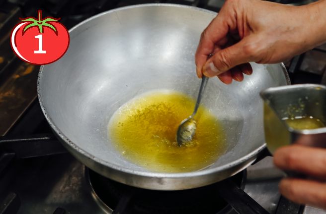 オイルとニンニクを火をつける前に入れることで、じっくりとオイルにニンニクの香りを移します。