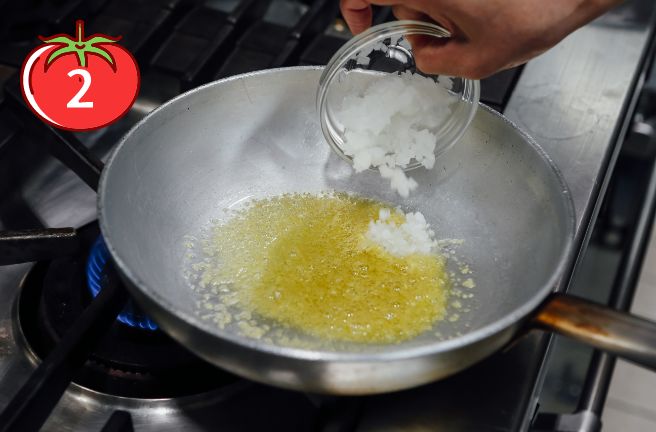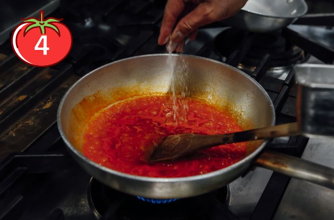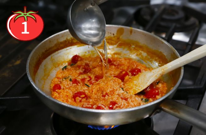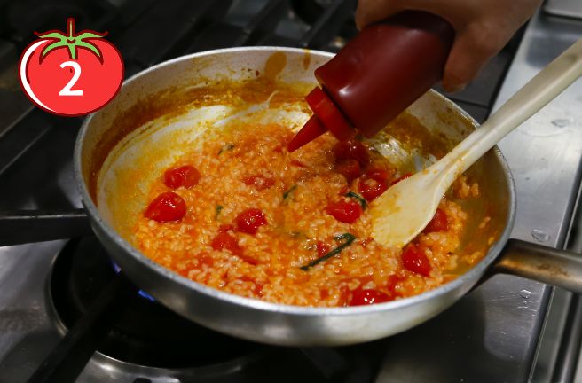 冷やごはんをトマトソースに入れ、お湯を少し加えながら混ぜ、軽く炒めます。