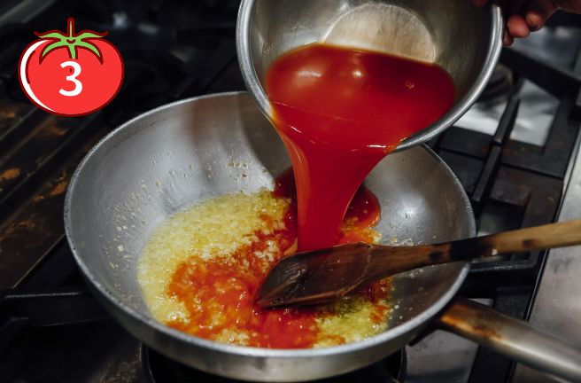 トマトジュースを入れたら、強火にして一気に煮詰めます。