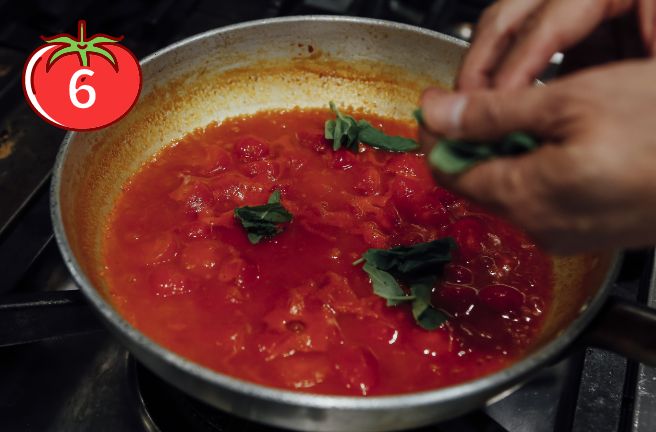 バジルを手でちぎりながら入れ、ひと煮立ちさせたら完成です。