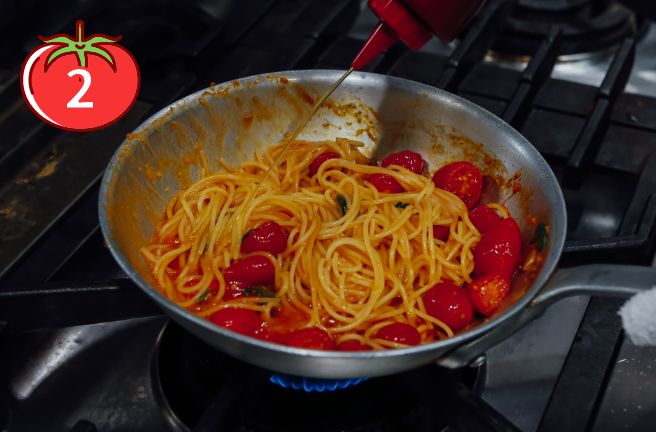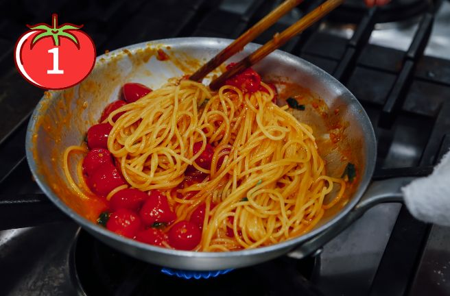 ゆでたパスタをトマトソースに入れ、ゆで汁を少し加えて軽く炒めます。