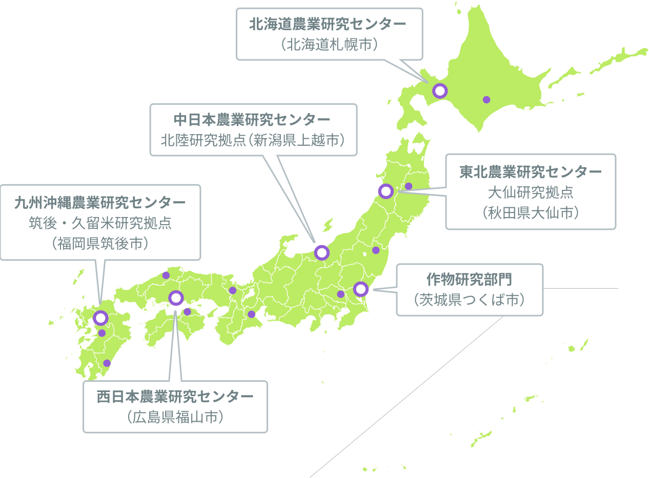 北海道から九州まで、6つの水稲品種開発を行う研究拠点を持つ農研機構。寒地、寒冷地、温暖地、暖地など、それぞれの地域の気候や環境に適した品種を開発することができます。