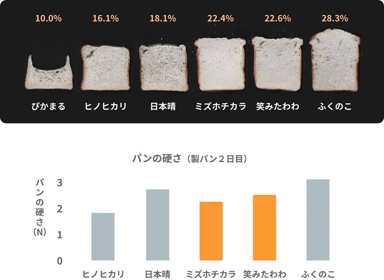笑みたわわは、パン用米粉に求められる膨らみの大きさが、親品種のミズホチカラと同等。膨らみが持続するため、パンを焼いてから時間が経っても美味しく食べることができます。