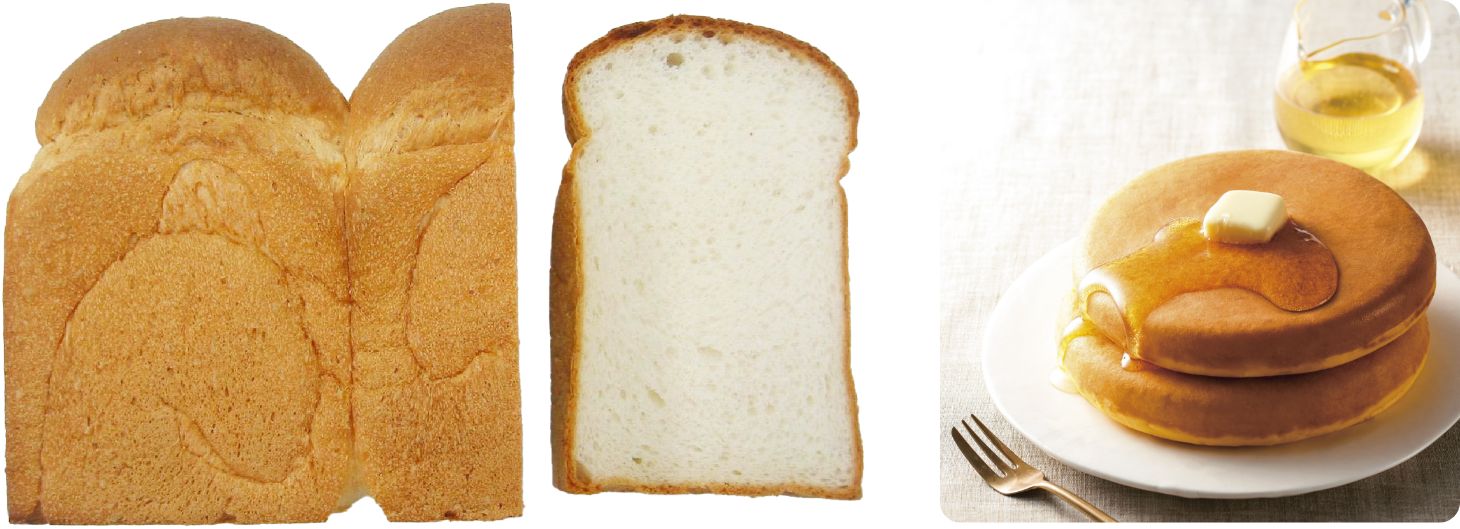ミズホチカラの米粉を使用したパン(左/写真提供:熊本製粉(株))と、笑みたわわの米粉を使用したパンケーキ(右/画像提供:(株)兵四郎ファーム)。小麦アレルギーの消費者も食べることができる、グルテンを含まない米粉100パーセントのパンに使用されるなど、海外でのニーズも高い米粉。今後、日本産米粉のさらなる輸出拡大にも期待がかかります。