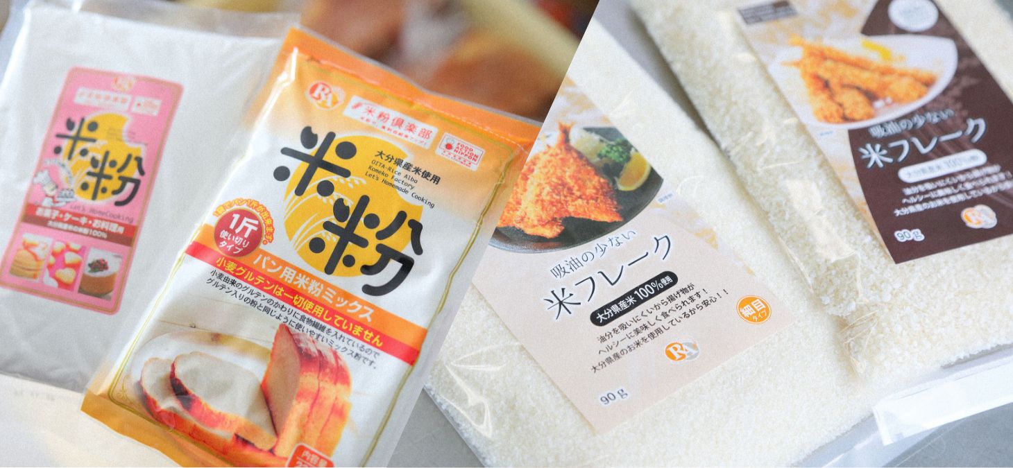 上:大分市の米粉製造専門会社「ライスアルバ」の「パン用米粉ミックス」と、パン粉のように使える「米フレーク」。大分県産米を湿式気流粉砕方式による製粉でデンプン粒子を壊さないことで、ふわりと軽く弾力性を持った生地になる米粉を製造しています。右:ライスアルバと共同で米粉パンの開発に取り組む、グルテンフリーの米粉パン専門店「虹の穂」には、食パンにバケット、惣菜パンなど米粉のおいしさが際立つ各種米粉パンがラインアップ。店舗はもちろんホームページでも販売しています。