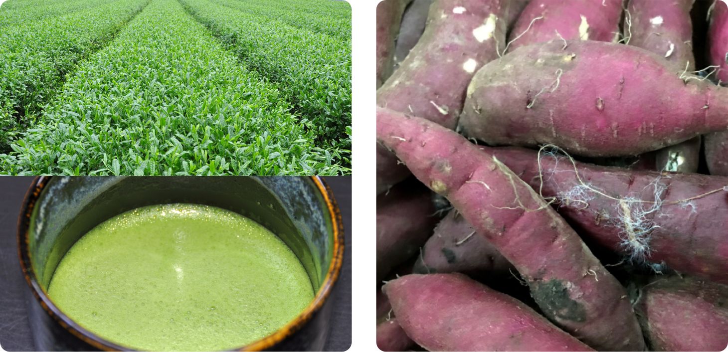 左:農研機構が育成した新品種「せいめい」(上)とせいめいを使用した抹茶(下)。特に被覆栽培での収量や品質が優れ、抹茶の製造に適しており、海外への輸出を目指しています。右:令和2年では軟腐病や青かび病の発症で、海上輸送中の腐敗率が平均25パーセント、推定8,700万円の損害が発生していました。そのため農研機構は腐敗防止技術を開発し、令和5年度までに腐敗率5パーセント以下の実現を目指しています。