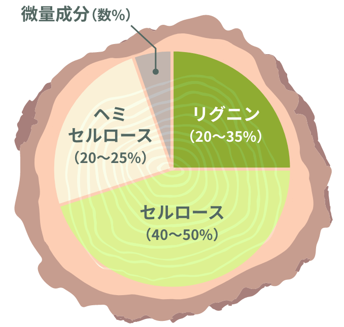 樹木は、20パーセントから35パーセントの「リグニン」と40パーセントから50パーセントのセルロース、20パーセントから25パーセントのヘミセルロース、そして数パーセントの微量成分で構成されています。リグニンは、樹木の強度を保つ成分です。