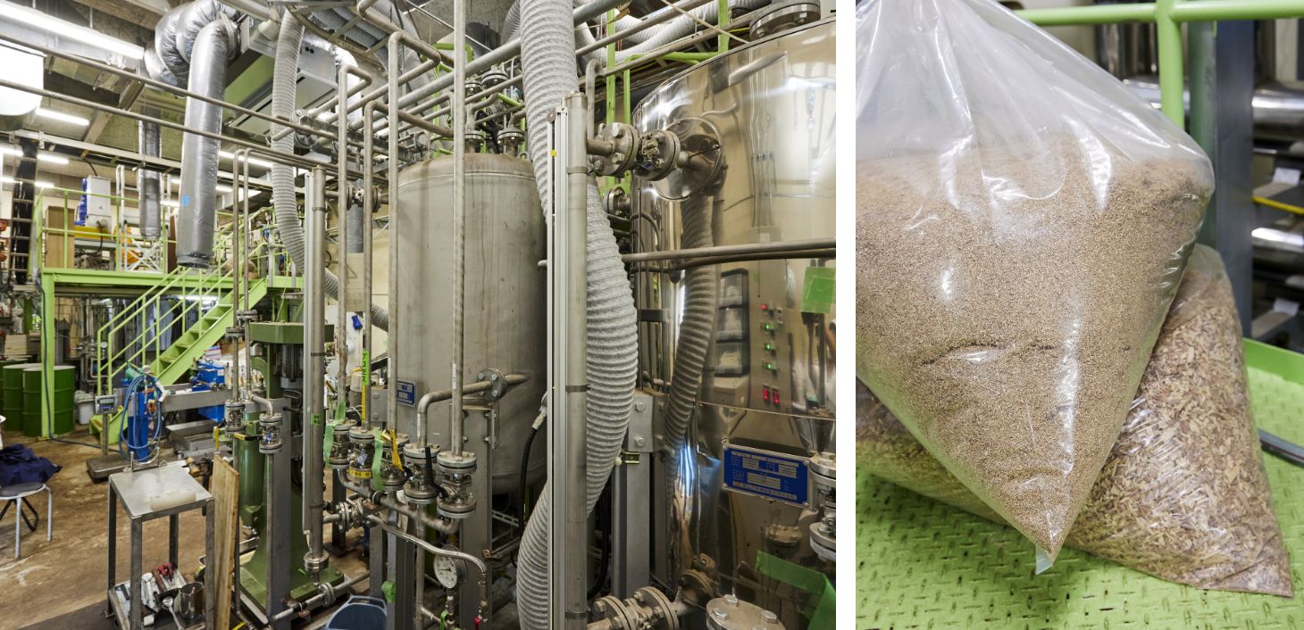 森林総合研究所内にあるベンチプラント。原材料のチップやおが屑から、約36パーセント相当の改質リグニンが取れるという。例えば50キログラムなら18キログラムが精製される。