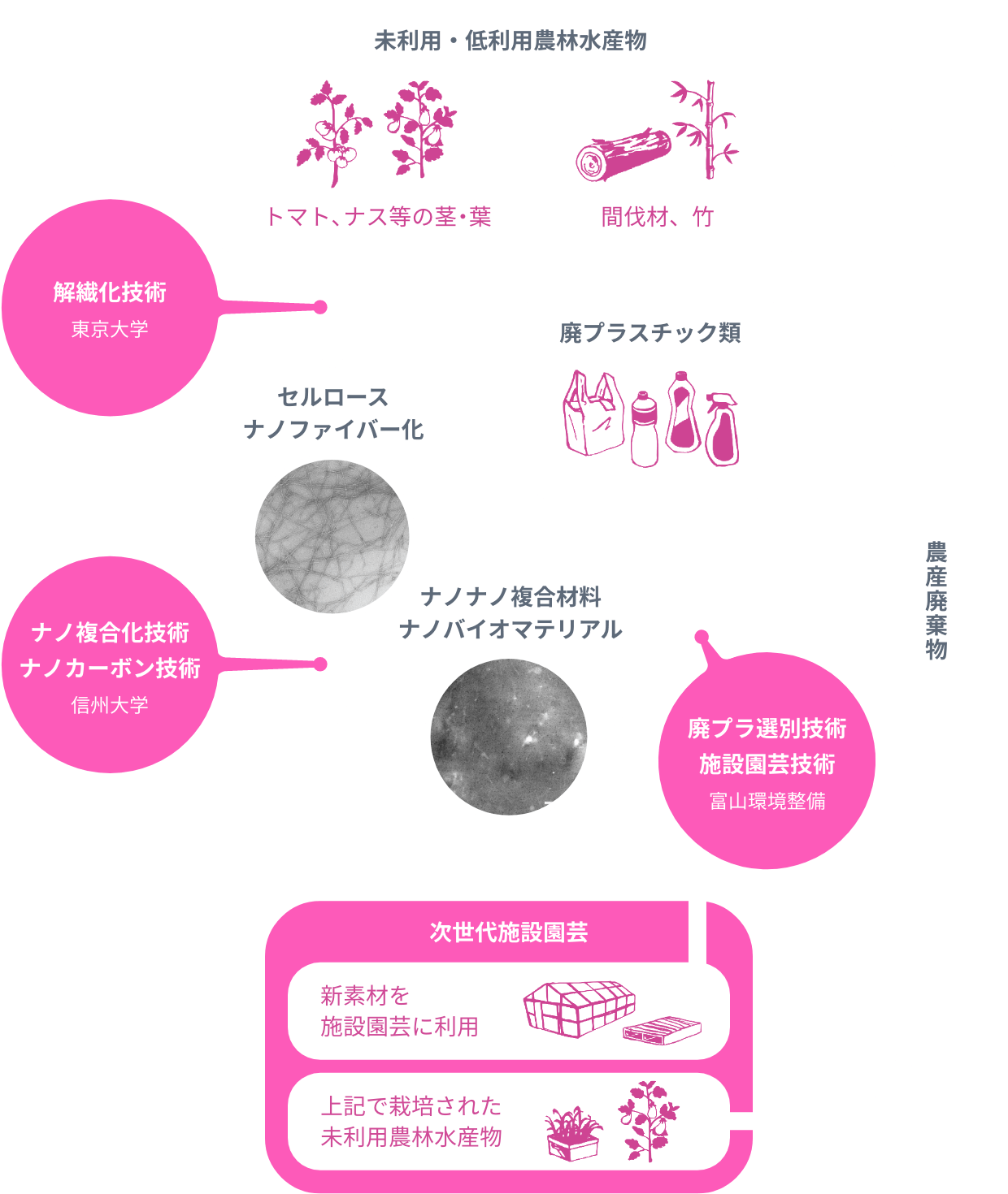 信州大学の野口徹教授が代表をつとめる「ナノアグリ・フォーカス・コンソーシアム」では、農産廃棄物などから製造するCNFと、廃プラスチックを活用した複合材料を活用し、農業資材の開発や、循環型の施設園芸サイクルの構築を目指しています。