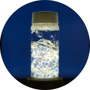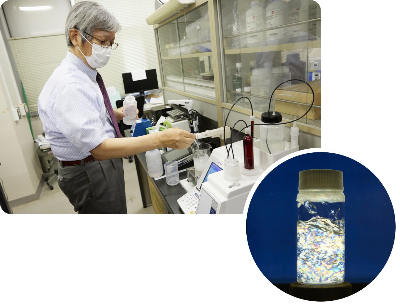 上:製紙用パルプを水に浸し、そこへ触媒酸化技術により処理。その後、ミキサーで撹拌をすることで、最終的には透明で高粘度なゲル状のCNFが完成します。右:肉眼では無色透明なCNFですが、偏光板をとおすと、ナノ分散化したCNFが光の屈折を起こし幻想的な姿を見せます。