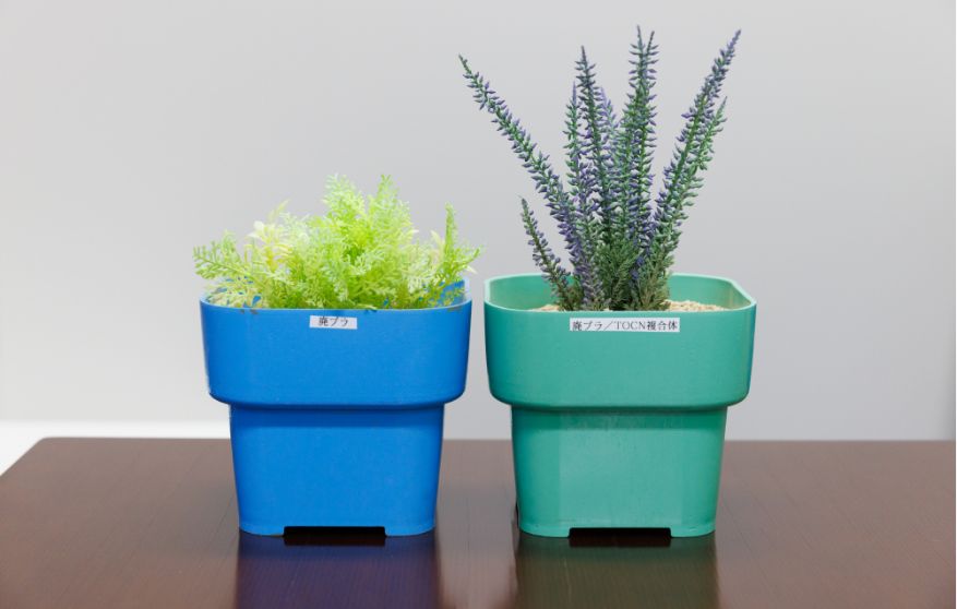 ポリエチレン製の鉢植え用ポット(左)と、CNFを添加したナノナノ複合材料で作ったポット(右)。
