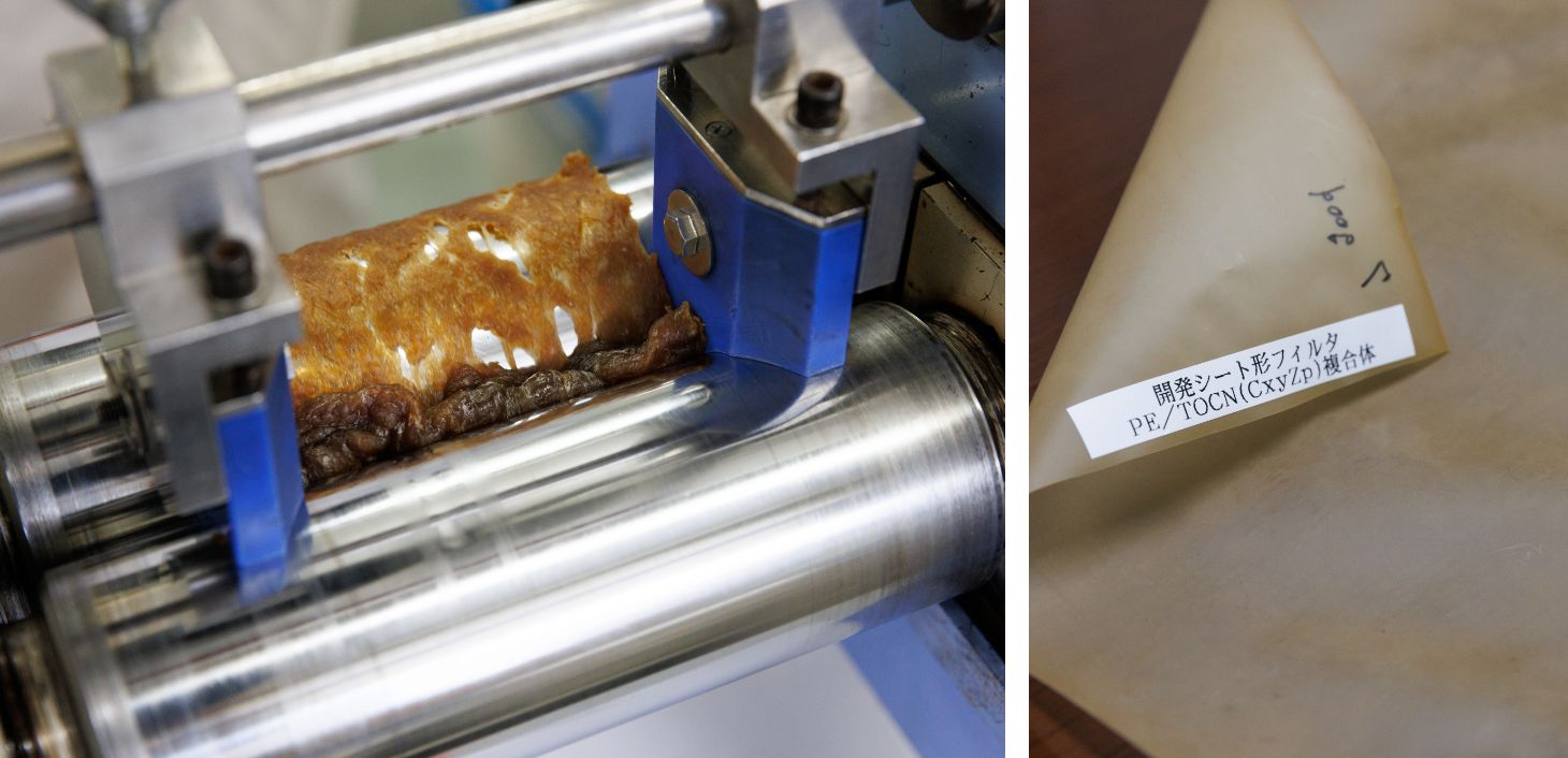 左上:混練機によりCNFと廃プラスチック剤などを混ぜ合わせ、高性能なナノナノ複合材料を作り出します。右左:天然ゴムにCNFを混練したシート型フィルタ。ナノサイズの網目構造で水分は通す一方、病原菌は通しません。