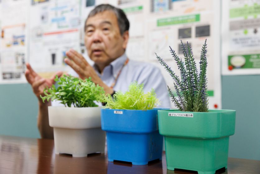 「青色のポットは従来の廃プラスチックから再生されたポリエチレン製ですが、石油由来の素材のため塗料が乗らないなど、加工に難があります。一方、緑色のポットがCNFを添加したナノナノ複合材料で作ったものですが、親水性があり、塗装をはじめ加工に何ら問題はありません。また、軽量で耐久性も高いため、ポット以上にハードな使い方が想定される各種の農業資材の素材にはもってこいです。もちろん、機能を満たさなくなった場合は、材料として再生することもできます」