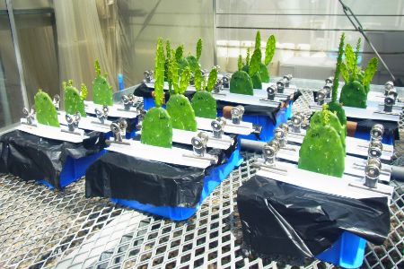 堀部研究室のハウスでは水耕栽培の研究も。「サボテンは環境中から吸収した重金属等の物質を茎内に蓄積します。この性質を利用し、水耕培養液の組成を制御することで、カルシウムやマグネシウム、鉄や亜鉛等の含量を高めた食用サボテンの生産を目指しています」と語る堀部准教授。この栽培方法を多くの生産者が導入できるよう、技術の確立と社会実装を目指し研究を続けています。