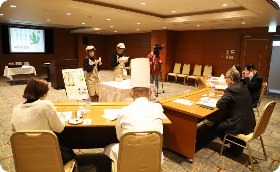 春日井市では食用サボテンの普及にも力を入れており、各飲食店がサボテンを使った創作料理を考案し提供しています。また、昨年「春日井サボテン スイーツコンテスト」が開催され、市内の事業者から多くの応募が寄せられました。画像は昨年の最終審査会の様子。