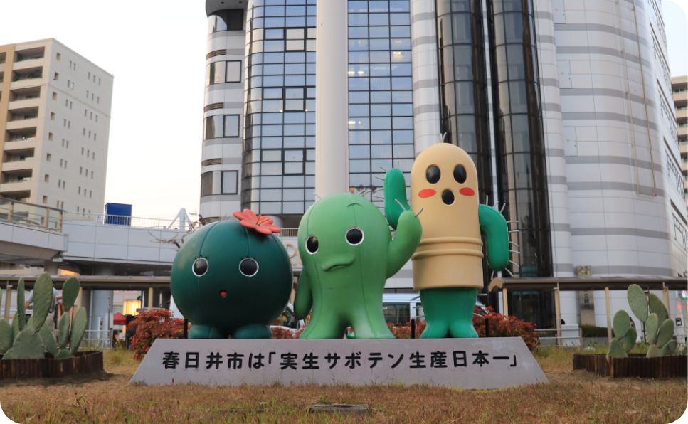 2007年に春日井サボテンキャラクターとして誕生した、左から、春代(はるよ)、日丸(にちまる)、井之介(いのすけ)。現在では、春日井市で行われるサボテン関連のイベントに欠かせない存在です。
