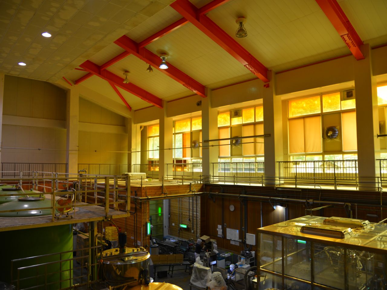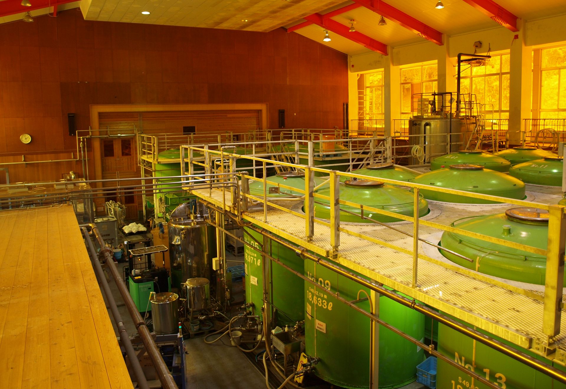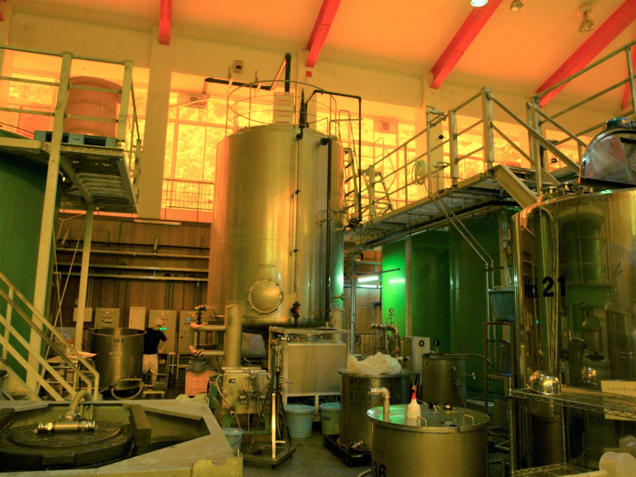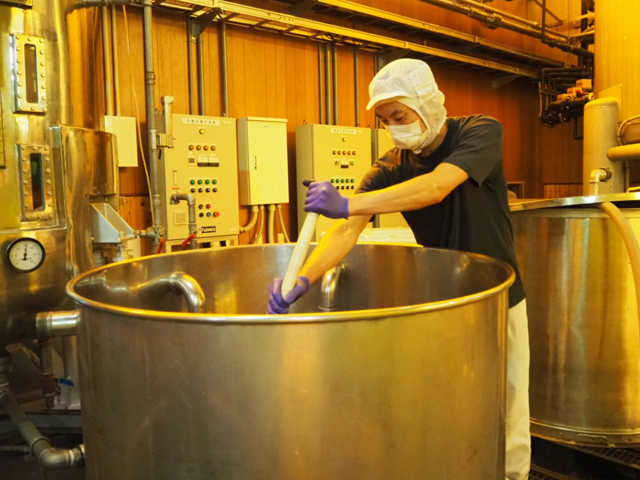 元体育館に足を踏み入れると、お酢特有のツンと酸っぱい匂いが鼻をつきます。目の前には、ずらりと並ぶ大型タンク。体育館は天井が高く広さがあるので、大型設備を入れる工場への転用に適していることがわかります。旧西谷小学校は1987年に建て替えられたため、1981年6月から施行された新耐震基準を満たしていることも、廃校選びの際の決め手になりました。「それでも改修費用はかさみました。重量物のタンクを設置するのに床を補強したり、お酢による酸化を防ぐためにFRP(Fiber Reinforced Plastics: 繊維強化プラスチック)加工を施したり。設備費用を含めて5億円近くに上りました」と大友さん。さすがにこれだけの工場にするには、大変なコストがかかるのですね。
