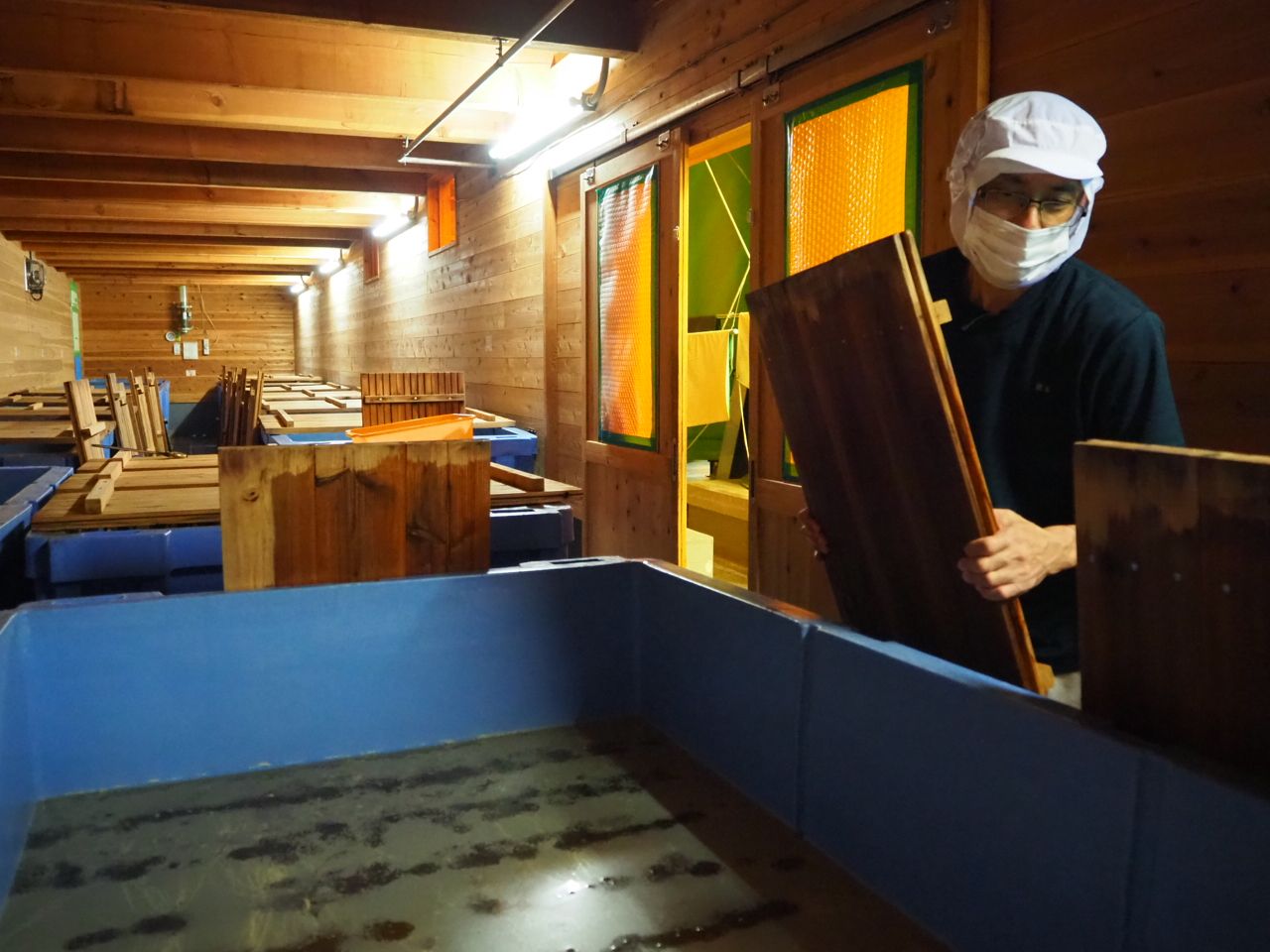基本となる醸造酢は、静置発酵法という昔ながらの製法にこだわっています。体育館のステージ裏を、床壁天井すべて杉板張りにした発酵蔵に。徹底した温度・湿度管理をしながら、じっくり時間をかけて発酵・熟成させていきます。手間と時間はかかるけれど、まろやかで風味豊かなお酢になります。