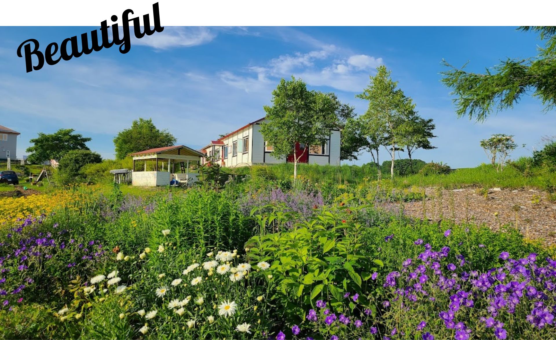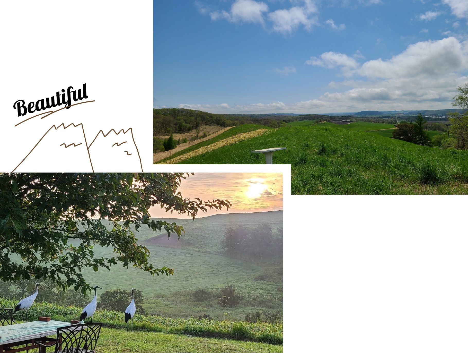 ハートンツリーの庭は、そのままなだらかな丘陵の牧草地へと続いていきます。時には庭でタンチョウの姿を見かけることも。「気づいたら、一緒に朝日を眺めていたんですよ」と言う服部さん。