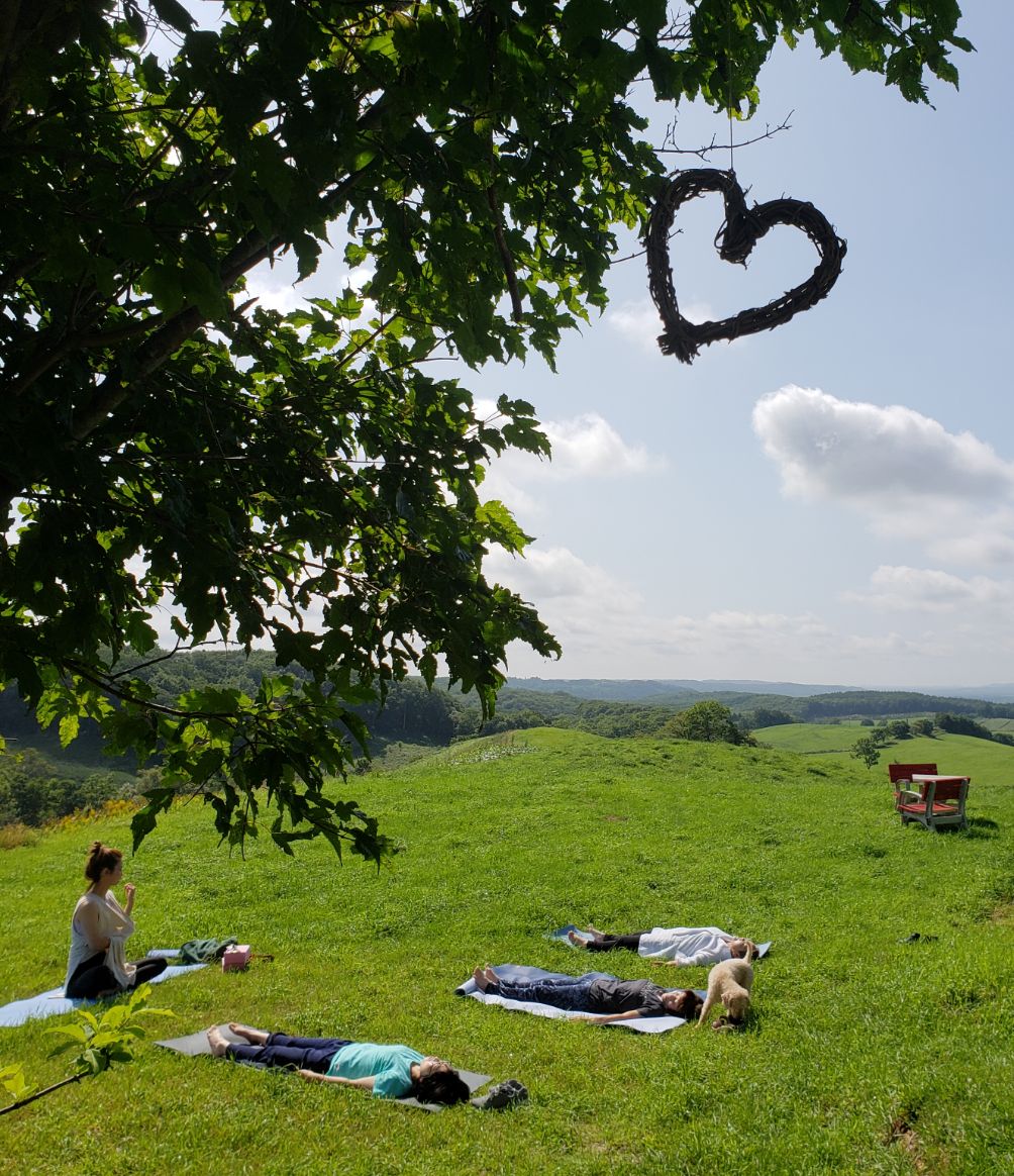 庭では不定期ですがインストラクターを招き、ガーデンヨガを行っています。優しいヨガによって、日々の生活のなかで固くなった身体と心も自然の中で解放。1時間ほどのヨガの後は、庭でランチを楽しみます。今後はハートンツリーから足を延ばして屈斜路湖でのピクニックヨガも予定しているそうです。