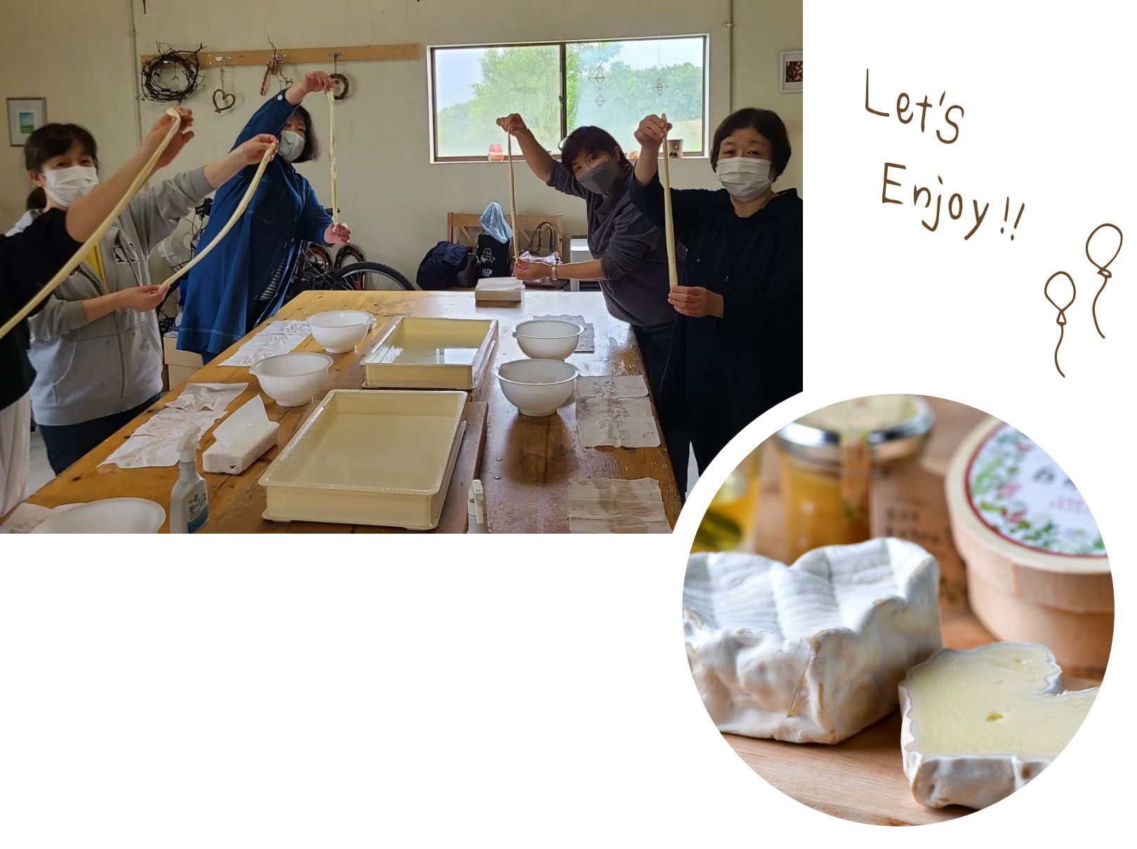 チーズ工房では地元農場の新鮮な牛乳を使ってチーズやホエイキャラメルを作っています。またゲストハウス兼体験工房の「グーテンガーデン」では、ストリングチーズやパンなどの手作り体験ができます。