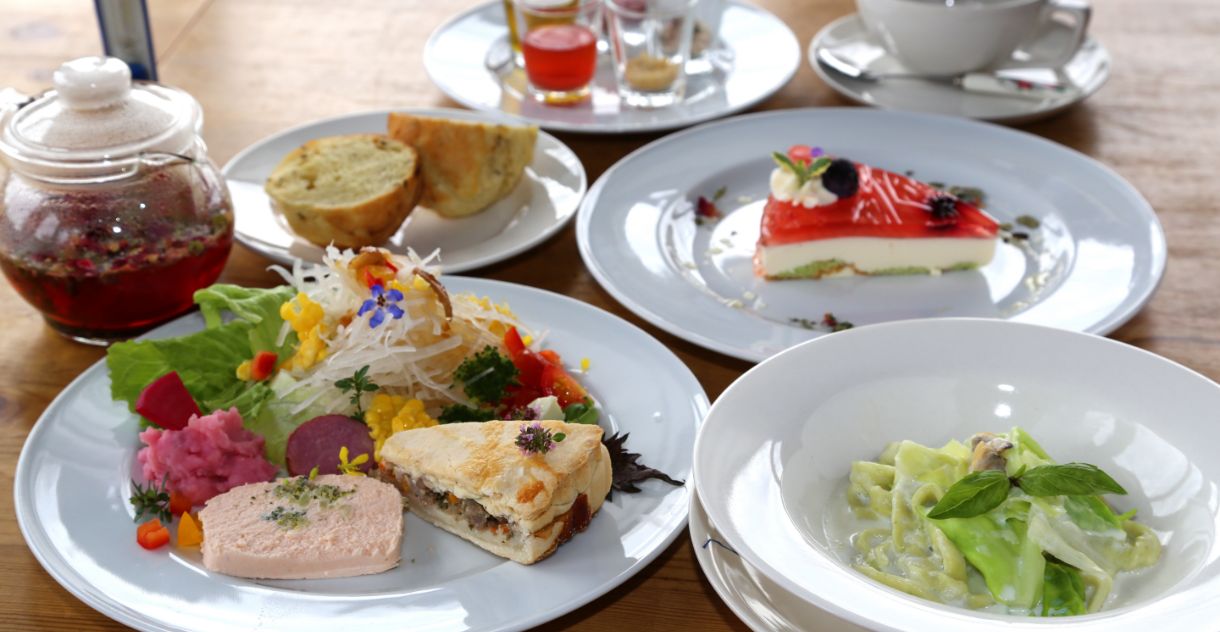 新鮮な牛乳、旬の野菜やハーブなど、地元の食材をたっぷり使った人気のランチセット「ガーデンランチ」。レストランはもちろん、天気のよい日には庭のテーブルで楽しむこともできます。