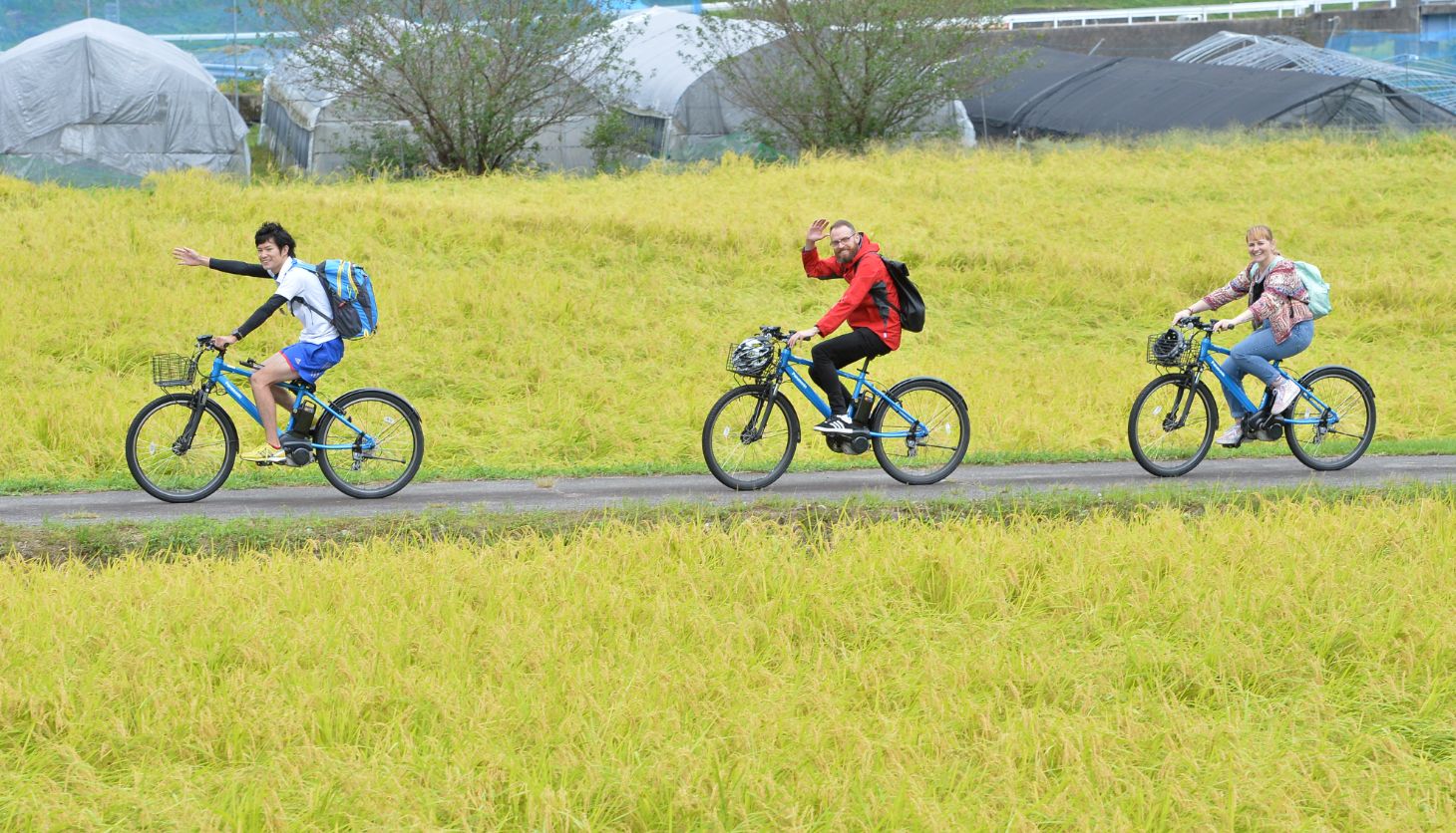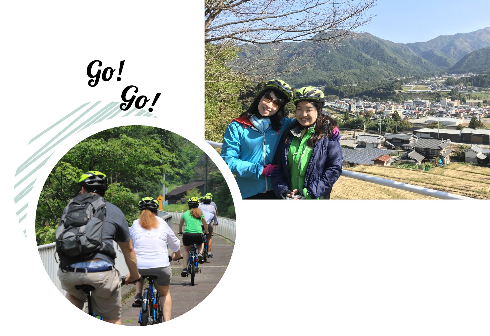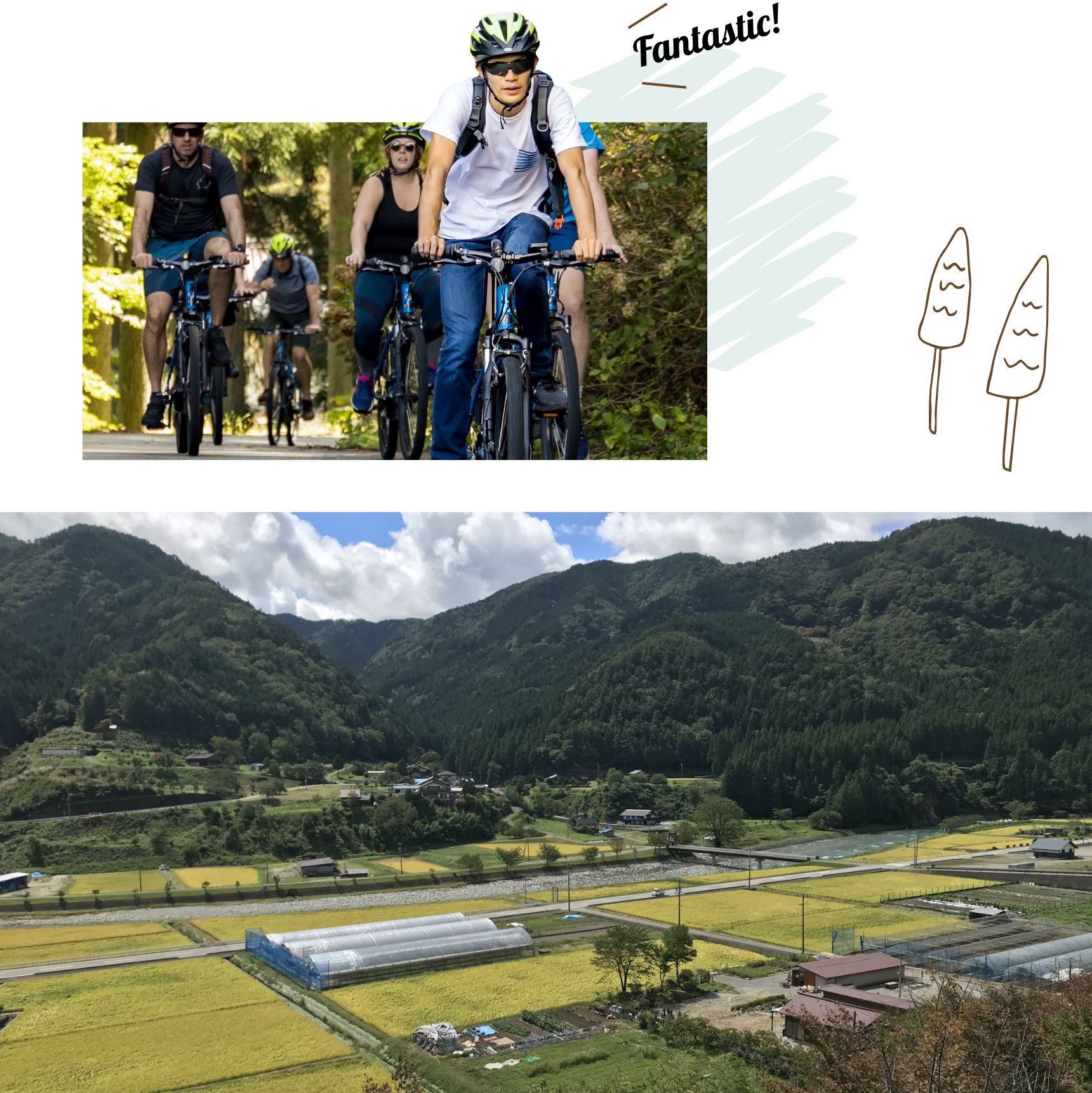 絶景ポイントを目指してE-Bikeを走らせます。傾斜のきつい上り坂もありますが、E-Bikeなのでラクラク。地元住民が手作りした展望テラスからは、山と川に挟まれたわずかな平野部に美しい田園が広がる馬瀬の姿が見られます。またツアー中にはいくつかのポイントで自転車を停め、ガイドが地域の文化や山間部の人々の暮らしについて話してくれます。