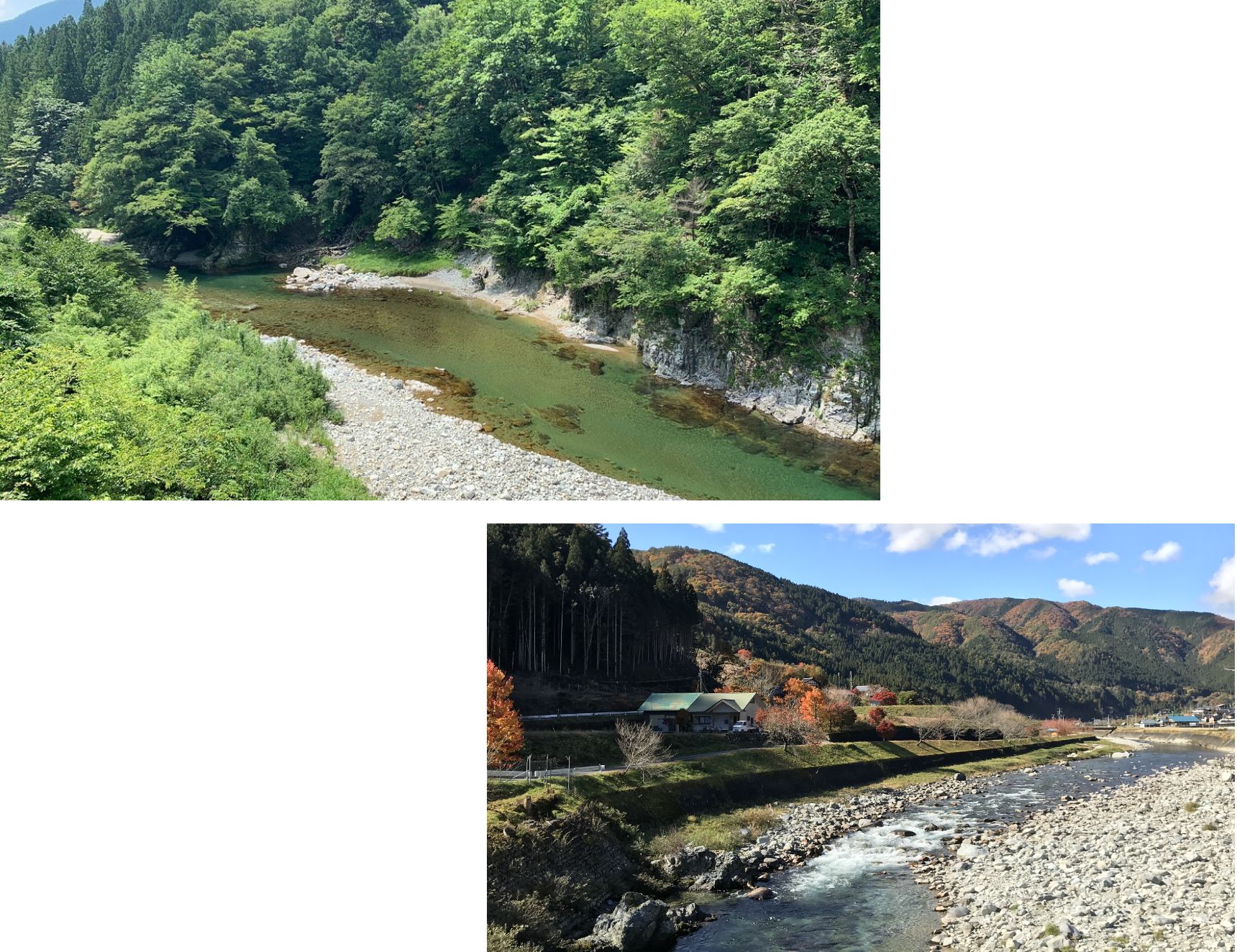 山道を15分ほど上り、峠の頂上付近から始まるトンネルをくぐって下りると馬瀬の風景が広がります。馬瀬川に沿って北上していくと、川は場所や季節ごとにさまざまな表情を見せてくれます。