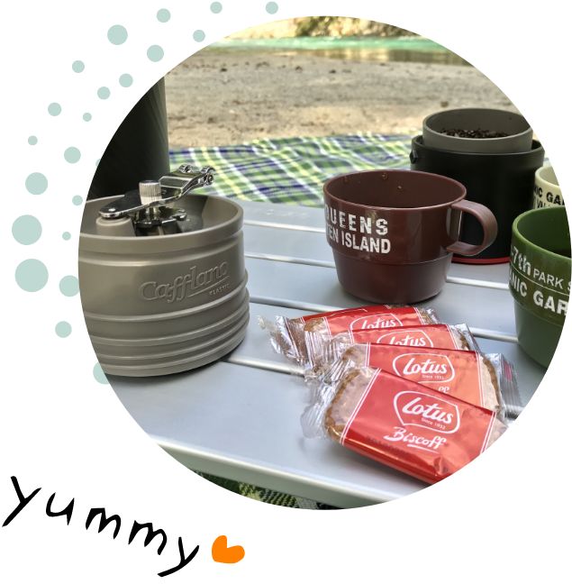 馬瀬川の連続する淵の中には、河原が広く、ひっそりとした雰囲気と相まってプライベートビーチ気分が味わえる所もあります。帰り道の途中でこの隠れ家的スポットに寄り、その場で挽いた豆で淹れたおいしいコーヒーを楽しみます。