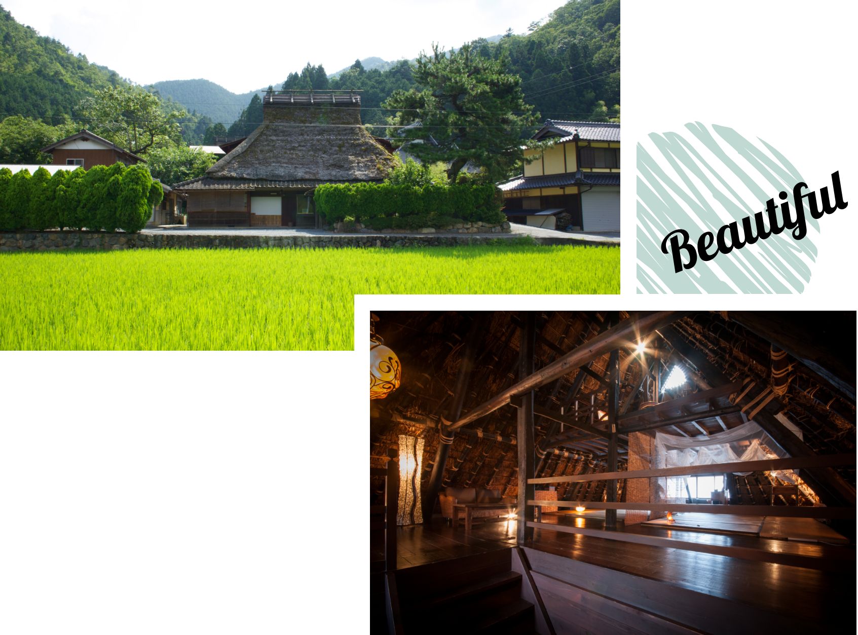 「美山FUTON & Breakfast」の建物は5棟あり、各々が数キロほど離れて点在しています。そのうち昔ながらの茅葺き家屋は「本館」と「美十八(みとや)」の2棟です。写真の「本館」は江戸時代末期に建てられたもので、国の登録有形文化財に指定されています。階段箪笥(たんす)を通じて屋根裏に上がり、茅葺きの裏側をじっくりと見ることができるのが最大の魅力。1階と2階の双方に寝室があるので、大人数のグループでもゆったり過ごせます。