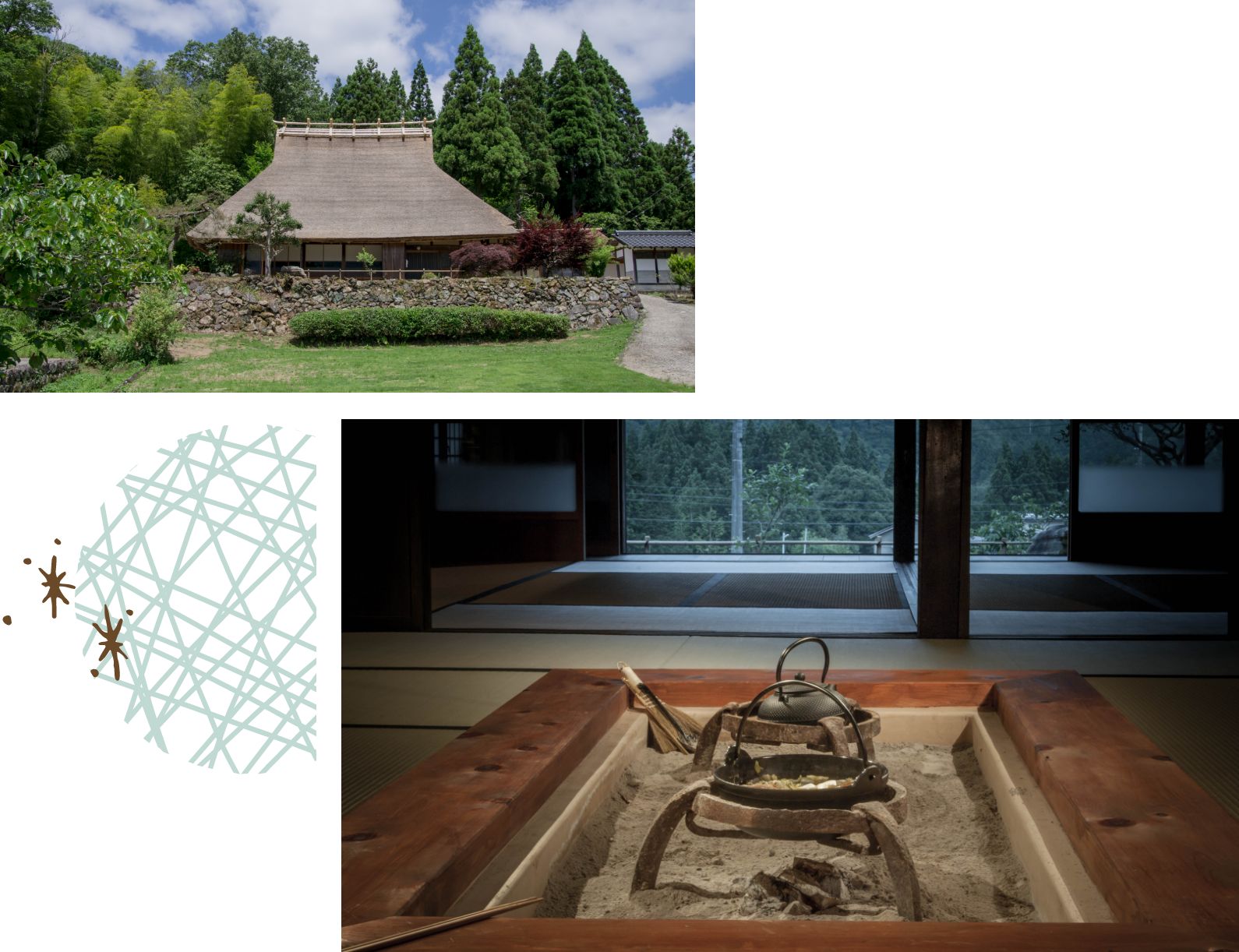 もう1棟の茅葺き家屋である「美十八」。こちらも築150年の古民家をリノベーションしたもので、特徴は広い縁側。縁側からは昔ながらの美山の葺き方をした屋根の、美しく刈りそろえられた軒を鑑賞できます。本館同様に1階には大きな囲炉裏があり、みんなで鍋を囲んで食事を楽しむことができます。