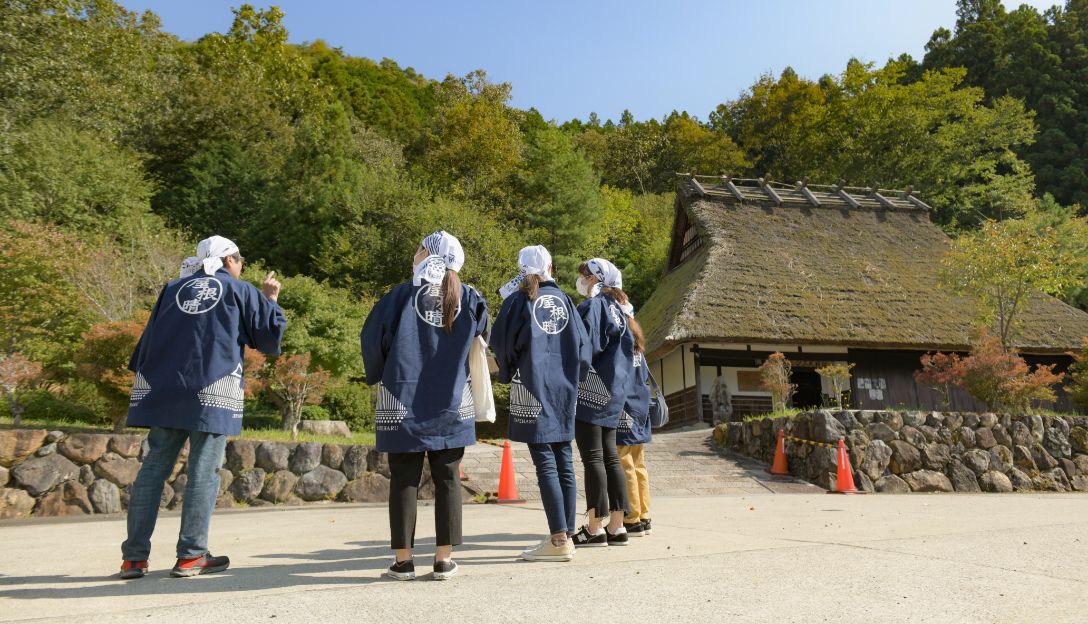 まず、茅葺きの基本的な知識について、専用ガイドブックや映像鑑賞などで30分ほど学びます。その後は法被と手拭いの職人スタイルになって体験場へ。移動の際には写真の「美山かやぶき美術館」など近隣の茅葺き家屋を見学します。