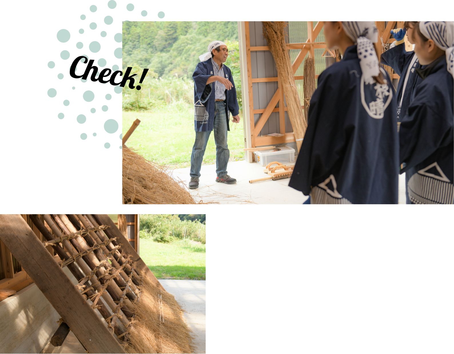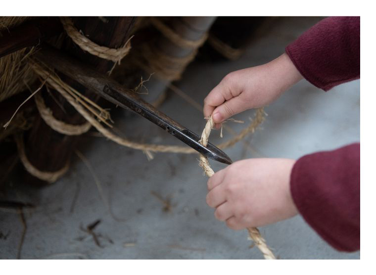 屋根葺きの作業は、内側と外側で連携しながら行います。茅を一列並べたら、上から竹で押さえつけたうえで、縄を通してしっかりと結びつけます。茅の厚みがあるので、外側から長い針を突き刺して縄を通し、屋根裏にいる職人が受け取って固定します。作業を円滑に進めるにはチームワークが大切です。