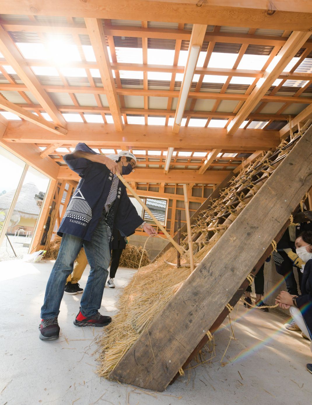 体験場には特別に組んだ体験用の屋根組があります。インストラクターの職人さんが見本を示しつつ丁寧にレクチャーしてくれるので、それに従って屋根を葺いていきます。