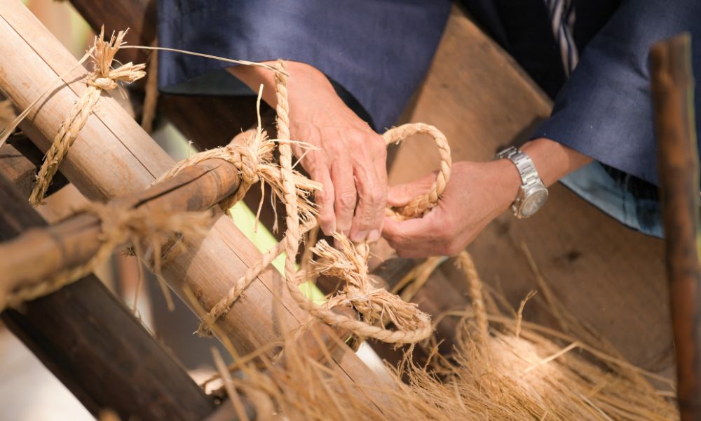 再び外側に戻した縄を「男結び」という結び方でしっかり竹に結び、茅を固定します。強く結べるようになるには相当な練習が必要だとか。