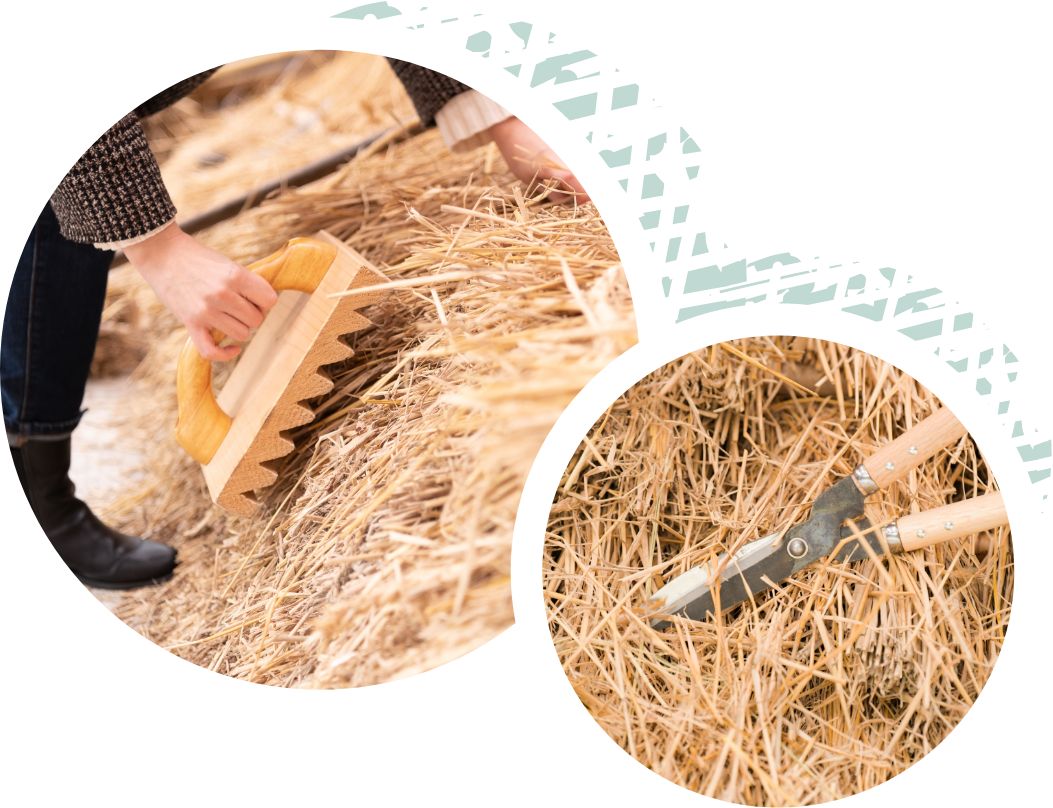 茅を縄で屋根に固定したら、「たたき」というコテ状の道具で叩いて形を作ります。そして仕上げとして、刈り込み鋏を使って茅の表面を美しく整えたら完成です。