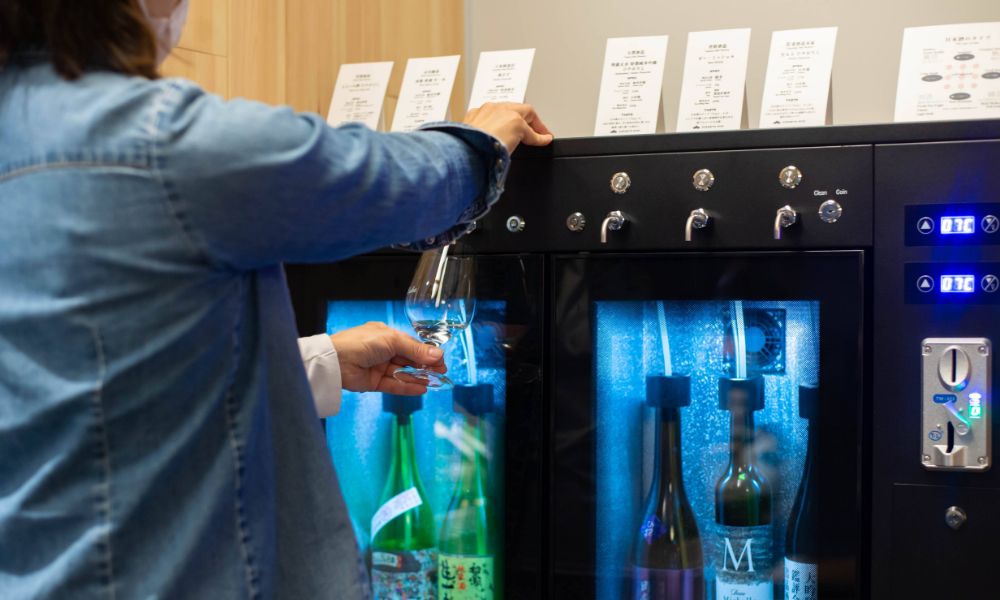 ホテル内にはコイン式の酒サーバーがあり、佐久地域で醸造された日本酒を楽しむことができます。日本酒好きにはたまらない設備です。