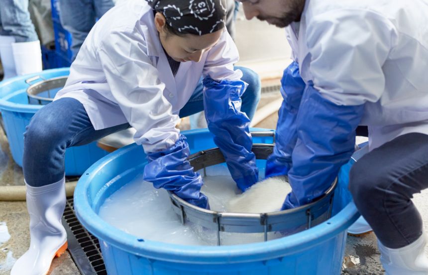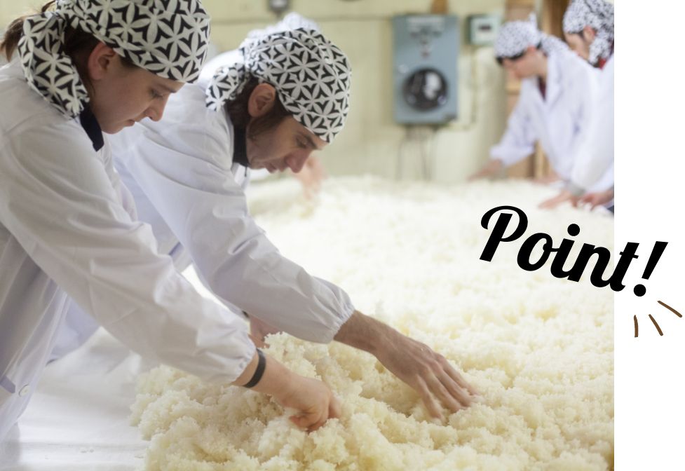 酒母を大きな仕込みタンクに移し、そこに水、蒸し米、麹を3回に分けて追加し麹を発酵させます(三段仕込み)。タイミングが合えば、この醪の作業ができることも。さらに醪を搾って清酒ができあがる作業(上槽)に立ち合えたり、そのできたての清酒のテイスティングができたりする場合もあります。