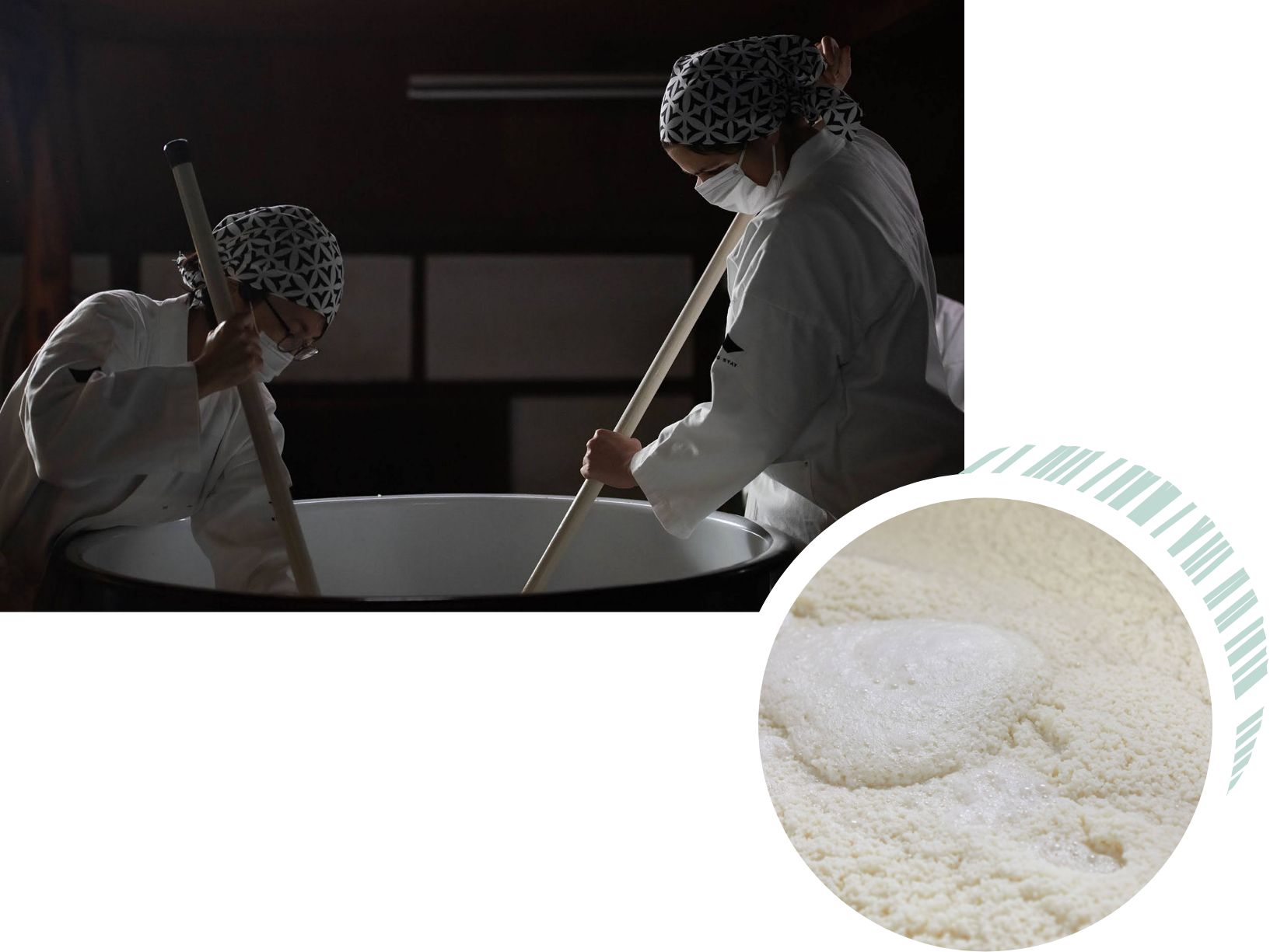 麹室(こうじむろ)という部屋で、麹用の米に麹菌を繁殖させる作業を行います。杜氏が種麹をふりかけた後、参加者全員が手で米を混ぜ合わせる作業を繰り返すことで、麹の「種付け」が完了。この麹造りは「製麹(せいきく)」とも呼ばれます。「一麹、二酛(もと)、三造り」という言葉があるぐらい、重要な工程です。1泊2日のプログラムでは、だいたいここまでの作業ができます。