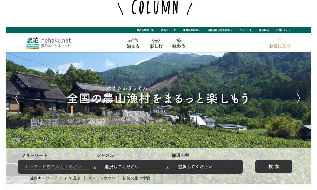 農泊に取り組む地域と農泊を体験したいユーザーをつなぐ情報を集約した総合サイト。全国の農山漁村の宿泊施設や飲食施設、農業体験などの情報を網羅し、エリアやジャンルの他、フリーワードでも検索できます。また宿泊施設はオンライン予約も可能。農泊に関するニュースやコラムも充実しています。