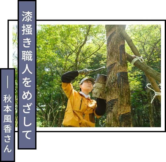 この日、地域おこし協力隊のメンバーとして漆掻きをしていた秋本風香さん。秋本さんは中高生の頃から、ハレの日などに使っていた漆器をかっこいいな、と思っていたそうです。美術大学に進学し、ものづくりを学んではいたものの自分にはあまりものを作り出すセンスがなさそうだと感じていた秋本さんは「ものづくりを支える人になろう」と決意します。そして、ある漆芸家との関わりから漆への興味を深くし、漆に関わる仕事を探そうと考えるようになりました。以前、漆芸家のグループ展に行った際にふと耳に入った「国産漆を使いたいけど、個人製作で使うには高いし、手に入りにくい」という話を思い出し、漆掻きを選んだのでした。