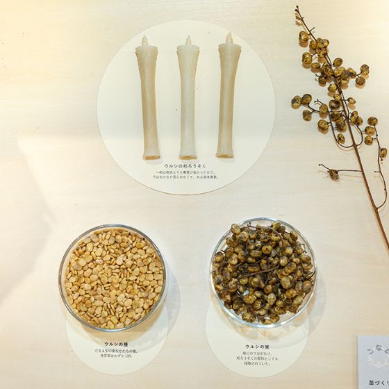 ウルシの果実。種は蝋に包まれた難発芽性で、発芽させるには蝋を取り除き、低温処理をするという手間が必要です。ぬぐった蝋は和ろうそくの材料になります。