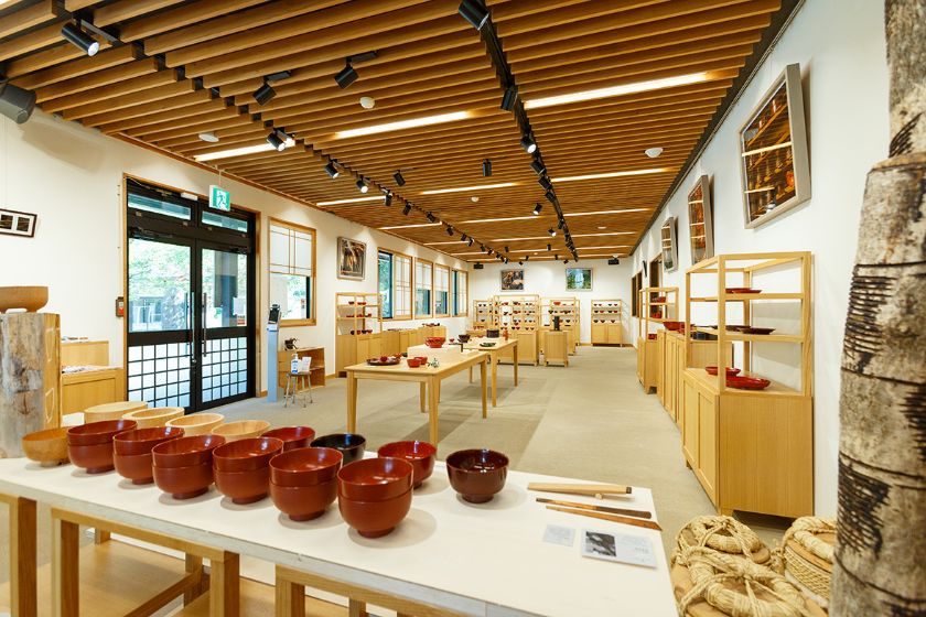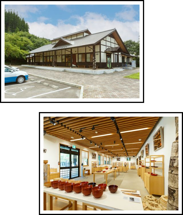 岩手県二戸市にある専門漆器製作工房「滴生舎」。展示販売を行うショールームと漆器製作工房からなり、浄法寺漆器の素晴らしさを伝えるため、ガラス窓越しに工房見学ができます。