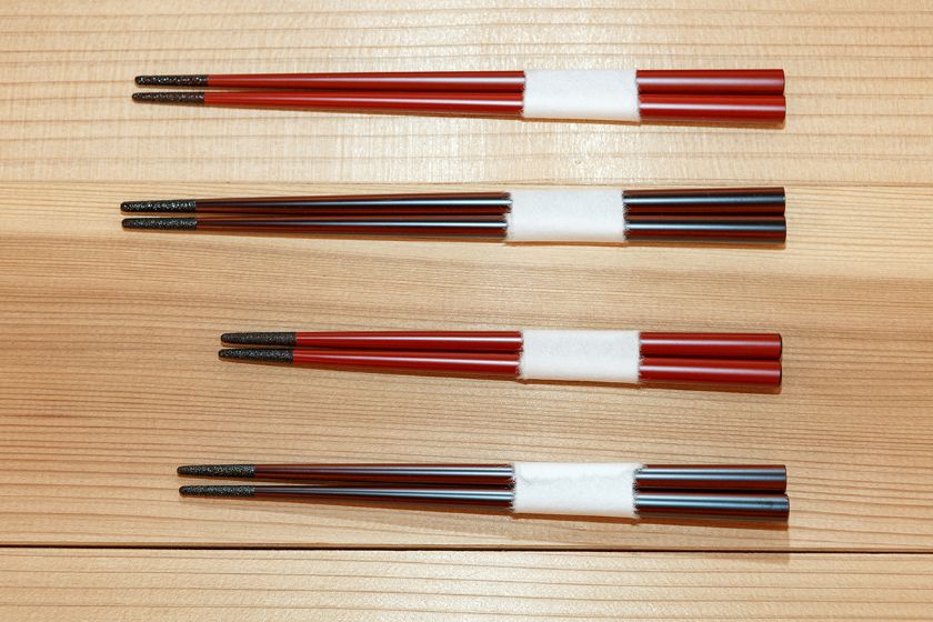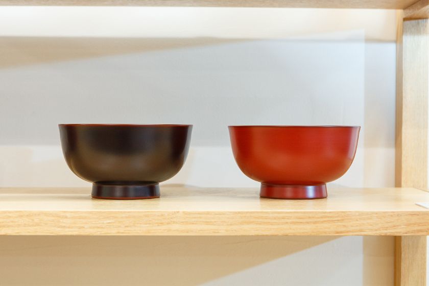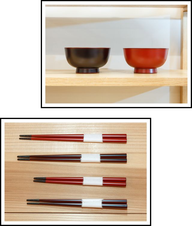 滴生舎で作られた浄法寺塗の椀と箸。塗りと研磨の工程を何回も繰り返してつくります。