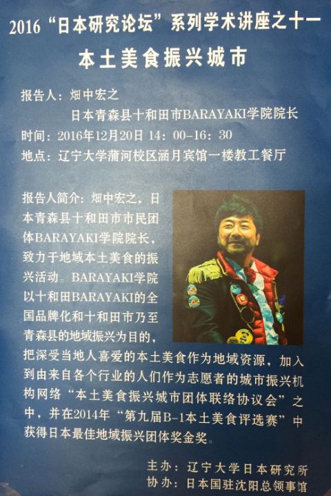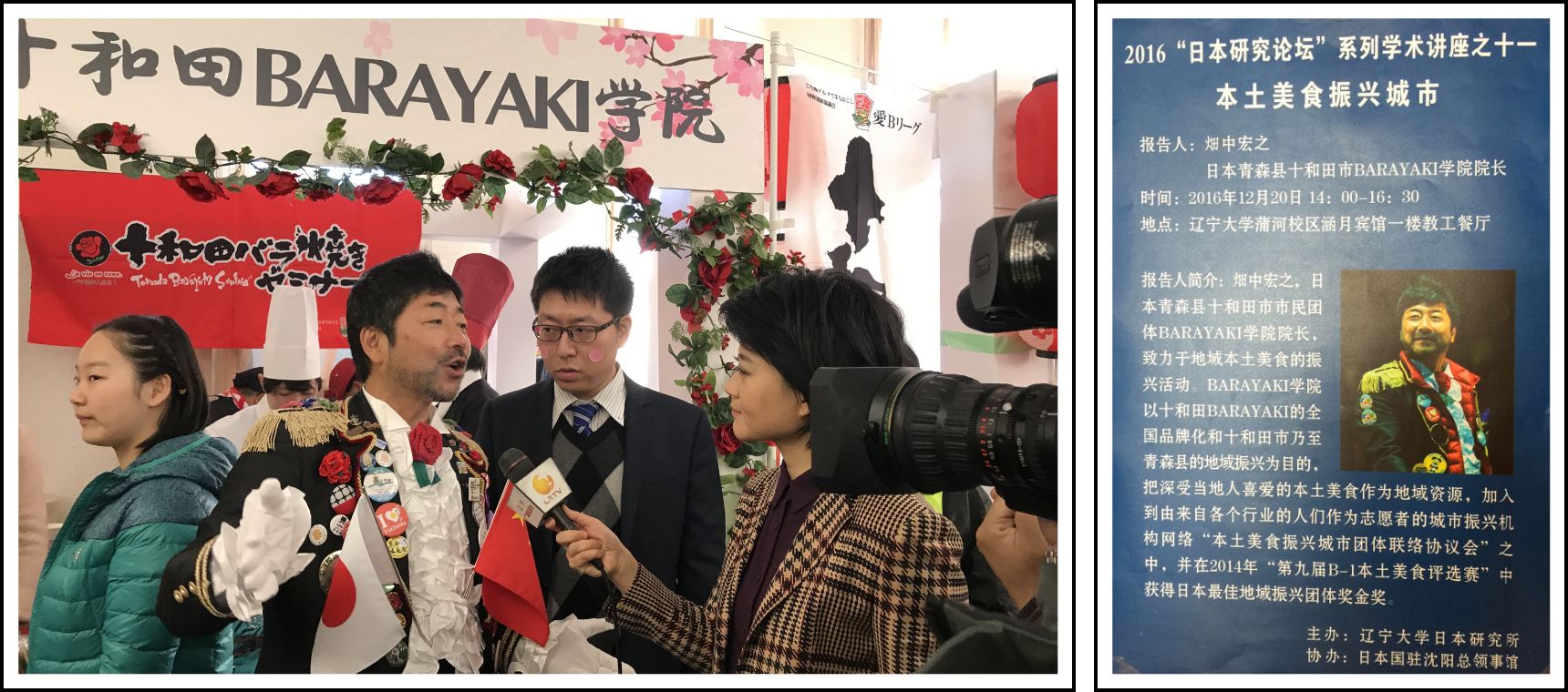 中国の大学の日本研究会が主催した日本食研究イベントのポスター(右)と、地元のメディアの取材に答える畑中さん。