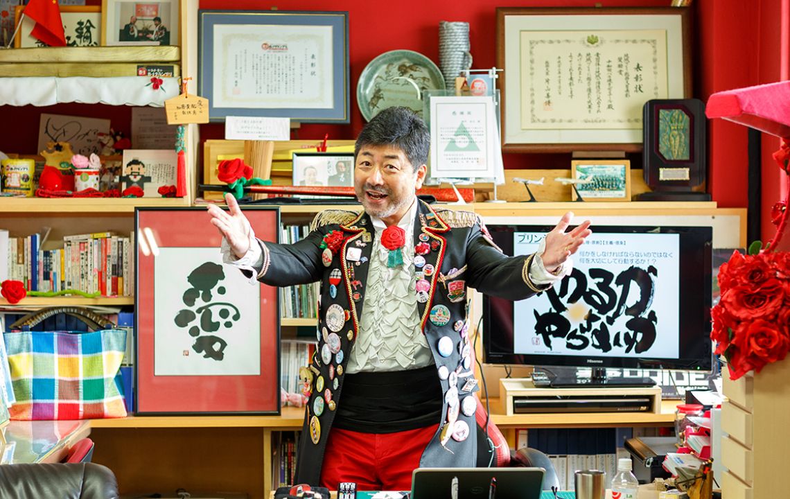 バラ焼きアンテナショップ「司」でバラ焼きを作る畑中さん。結婚式の衣装も扱う美容室を経営する畑中さんだからこそあつらえることができた衣装。国内外問わず、どこに行くにも誰に会うにも、もちろんいつもこの姿です。