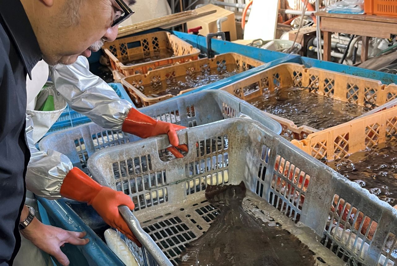「ここは伊勢志摩。地元で水揚げされる魚介類の魅力を多くの人に伝えたい」。そう話すオーナーシェフの河瀬毅さんが、朝一番に出かけたのは、二見町今一色の漁師さんのところです。この日は、底引き網漁で獲れた伊勢湾のヒラメやヨシエビを買い付けました。優れた食材を求めて生産者のもとに足繫く通うのは、河瀬さんのライフワークです。