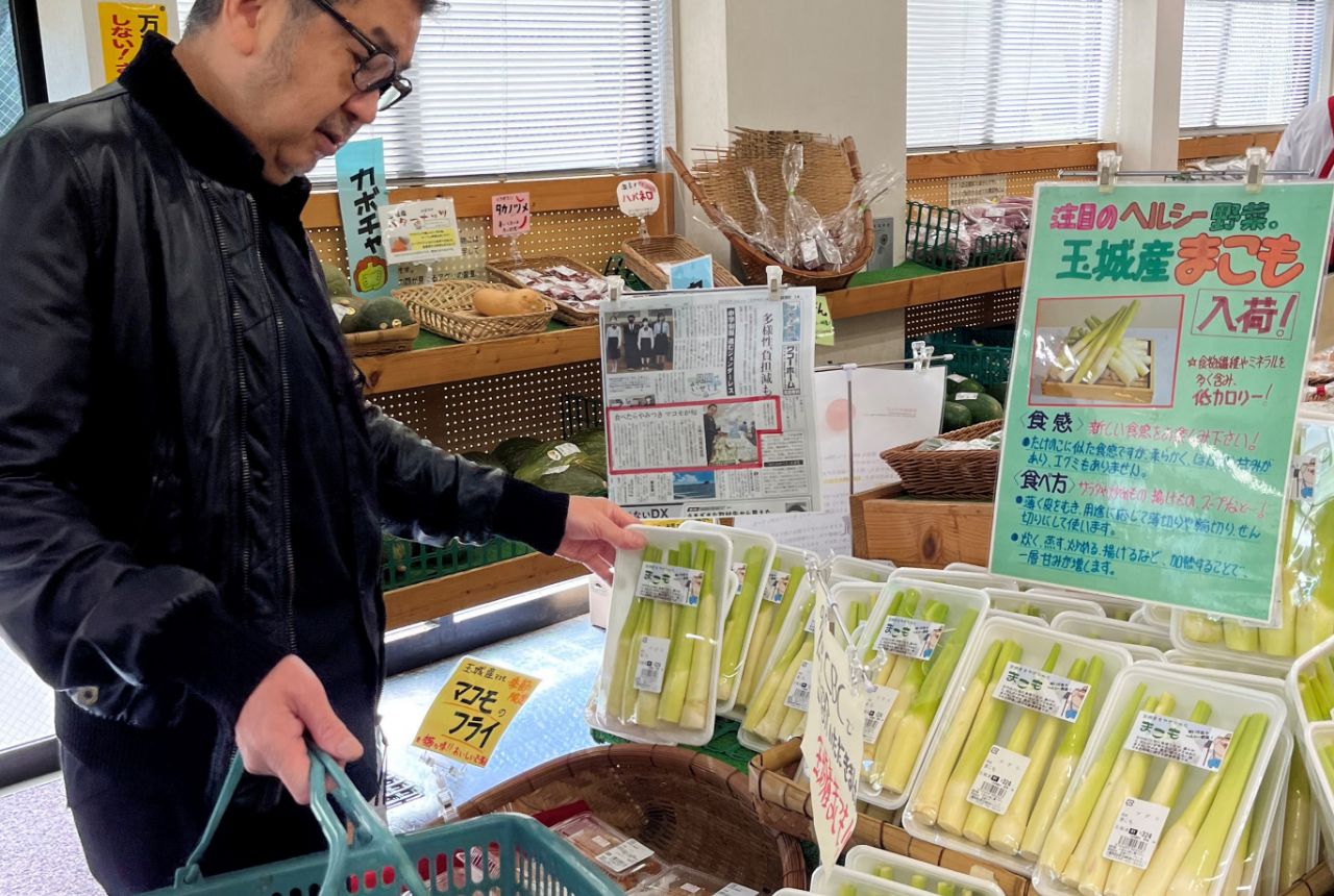 次に向かったのは、度会郡玉城町の農畜産物を産直販売する「ふるさと味工房アグリ」。ここでは旬のマコモダケを仕入れました。たけのこよりやわらかい食感とほのかな甘味が特長の野菜です。「ほかには地元の朝獲り野菜コーナーがあるスーパーマーケットにもよく出かけます。これは!と思う生産者さんの名前は控えておいて、あとで連絡したり、店で少し待って、その方が野菜を置きにきたときに声をかけたり。仲良くなって畑を訪ねるのが楽しみなんです」