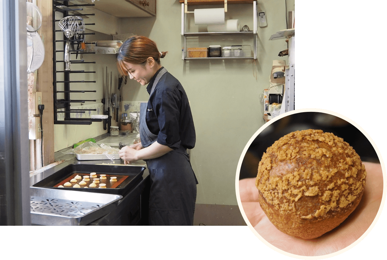 厨房ではスーシェフの奥田佳那さんがデザートのプチシュークリームを作っています。奥田さんはドラマ「高校生レストラン」で知られる相可(おうか)高校の食物調理科出身。河瀬さん曰く「奥田は8年前に高校を卒業してすぐうちに来た頃から優秀でしたね。天性の勘があるうえに、僕のやることをよく見ています。こんな真ん丸なシュークリームを作れる人ってなかなかいないですよ」