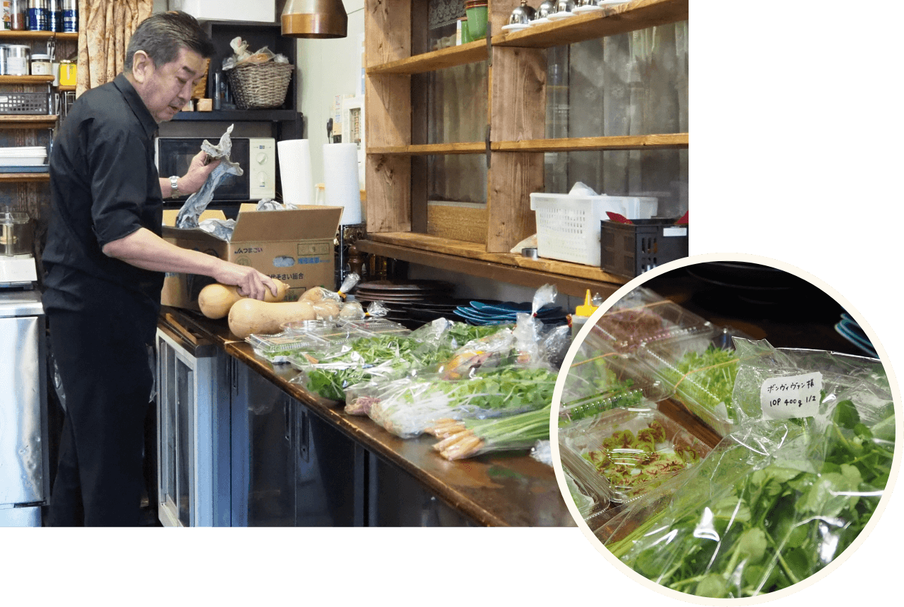 「いつも農業屋の担当者とLINEでやり取りしています。こんな野菜がほしいとお願いすると、各生産者から取り寄せて箱に詰め、最寄りの店舗に配送してくれるんです。このシステムのおかげで、個別に取り寄せる手間とコストがかからなくなりました。県内のいろいろな生産者さんを知るきっかけにもなっています。今では仲間のシェフたちも大勢利用しているんですよ」